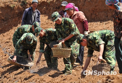 由青年民兵组成的昆明警备区东川区人民武装部抗旱突击队顶着烈日帮助山区群众进行春播春种。 中新社发 吴苏琳 摄