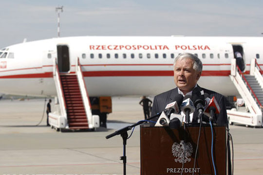 资料图为2008年8月8日,在波兰克拉科夫机场,波兰总统卡钦斯基在一架图-154飞机前发表讲话。