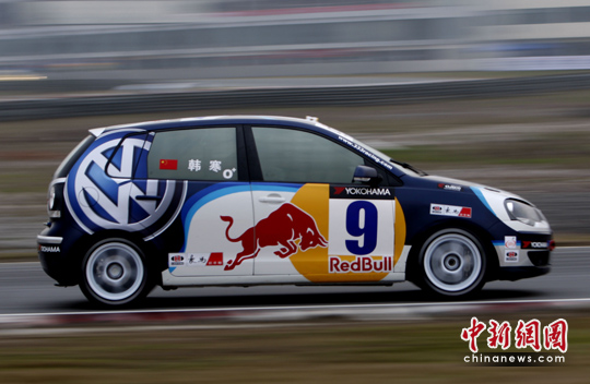 经过一场雨战,驾驶9号赛车的上海大众333车队韩寒获得1600cc组冠军,取得本赛季开门红。中新社发 赵振清 摄