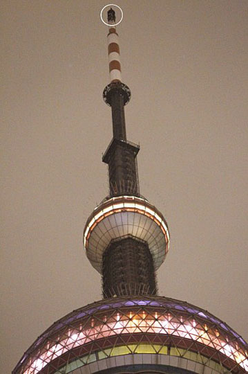 圆环标注处即为东方明珠塔起火部位(4月13日摄)。裴鑫 摄