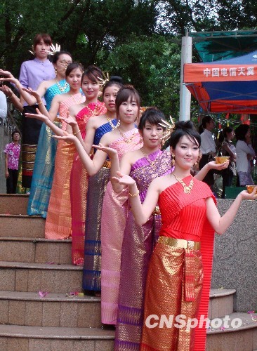 4月13日,千余名来自老挝、泰国、越南等东盟国家的青年留学生身着特色民族服饰在广西民族大学欢度新年泼水节。中国与东盟学生同台表演浓郁民族风情的舞蹈,并一起跳团圆舞,互祝吉祥。中新社发 黄艳梅 摄