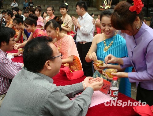 图为泰国留学生为参加活动的嘉宾及中国学生洒水送祝福。中新社发 黄艳梅 摄