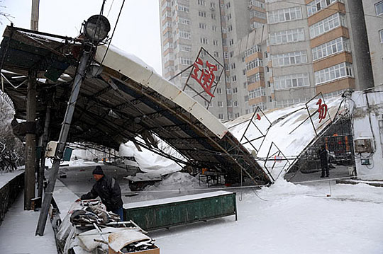 图:哈尔滨一市场在风雪中倒塌