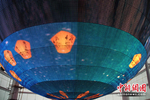 4月13日,台北举行“2010年上海世博会台湾馆启航记者会”,馆内设计及展演内容首度曝光。图为台湾馆的巨型LED球体,正在进行灯幕测试。(台北世贸中心供图)中新社发 董会峰 摄
