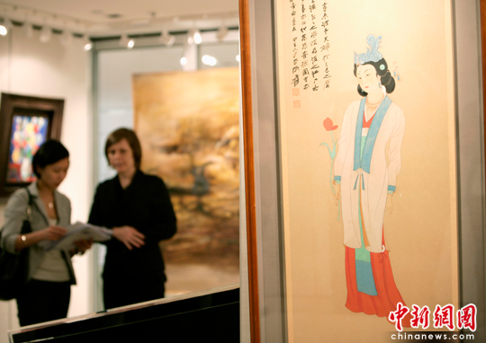 4月13日,香港佳士得春季拍卖亚洲艺术传媒预展上,展出张大千(1899-1983)“拈花仕女图”(估价二百万至三百万港币)。