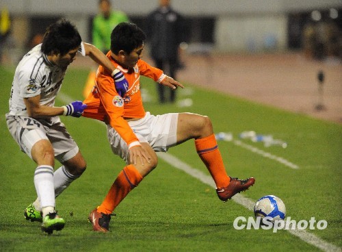 2010年4月13日,2010年亚洲足球冠军联赛小组赛在中国山东济南的一场比赛中,山东鲁能泰山足球队主场以2-3不敌日本广岛三箭队。中新社发 张侃 摄