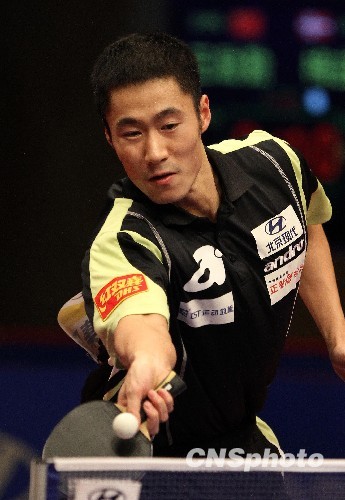 4月13日晚,2010亚欧全明星乒乓球对抗赛结束了首日第一回合的争夺,欧洲队大比分4:1领先亚洲队。在颇受国内球迷关注的第三场比赛中,王励勤与梅兹苦战五盘,结果以2:3告负。中新社发 王韶骅 摄
