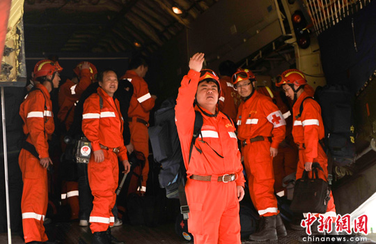 4月14日下午3时,中国国际地震救援队从北京南苑机场出发赶往青海玉树灾区。中新社发 廖攀 摄