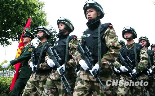 4月14日,浙江绍兴的公安、武警和志愿者、社区干部等近千人正在参加上海世博会“环沪护城河”安保工作启动仪式。当日,绍兴市开始全面进入上海世博会“环沪护城河”安保状态,绍兴市世博安保工作还包括第六届世界合唱比赛和建城2500年庆典系列活动安保任务。中新社发 袁云 摄