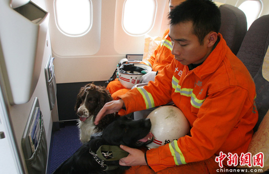 图为随行的三只搜救犬。中新社发 易世忠 摄