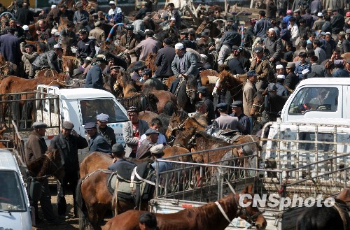 据当地畜牧部门介绍,由于该市场紧邻218国道,交通极为便利,吸引大批南北疆活畜经纪人到此交易,每周交易大小活畜达6000头左右,成为北疆地区重要的活畜集散地。中新社发 刘新 摄