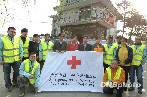 图为14日下午,北京市红十字会蓝天救援队首批队员整装待发,他们将乘坐3辆越野车日夜不停赶赴灾区。中新社发 李学仕 摄