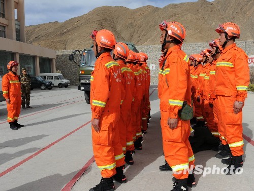 据了解,这是西藏消防总队派出的第三批赴玉树灾区的救援队伍。救援队携带了各种先进的救援设备。其中包括雷达生命探测仪、蛇眼生命探测仪及各种破拆、顶压设备。中新社发 陶盛楷 摄
