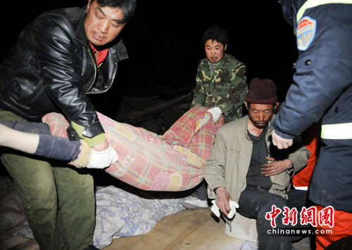 4月15日凌晨1时,玉树县的民众在中国国际救援队队员的帮助下清理遇难者遗体。中新社发 廖攀 摄