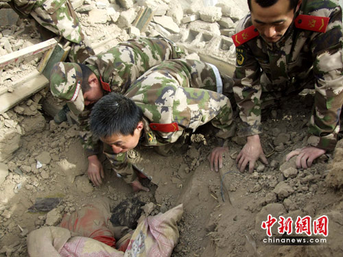 4月14日11时,武警玉树支队的战士在玉树县结古镇地震废墟里救助被困民众。中新社发 张守国 摄