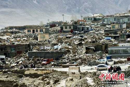 4月14日16时,地震后的玉树县结古镇损失惨重。中新社发 张守国 摄
