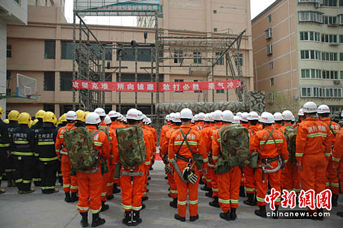 截至4月15日9时,甘肃应急救援总队抗震救灾突击队第二梯队已到达玉树地震灾区。该总队先后派出的两个梯队共有250人,配备有28辆抢险车,并携带抗震救援的有关装备及器材,随即在灾区展开抗震救援。(图片由甘肃省公安消防总队宣传处提供)