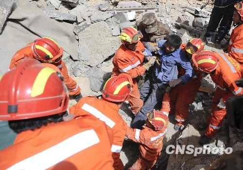 4月15日,中国国际地震救援队在青海玉树县结古镇西北牛宾馆废墟上救出了四名幸存者,其间经历了三次余震。中新社发 廖攀 摄