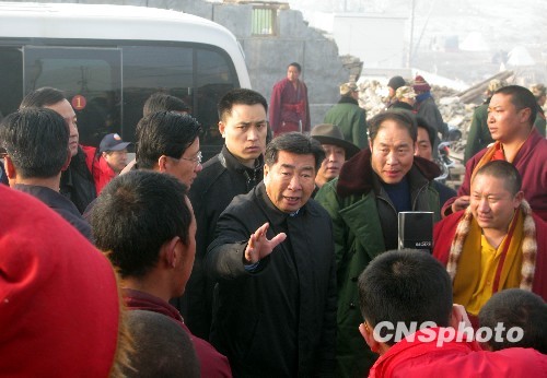 2010年4月15日,青海玉树进入震后第2天,国务院副总理回良玉看望、慰问震区灾民和现场搜救人员。全国各地多支救援力量集结玉树,灾区的搜索救援工作已全面展开。中新社发 孙自法 摄