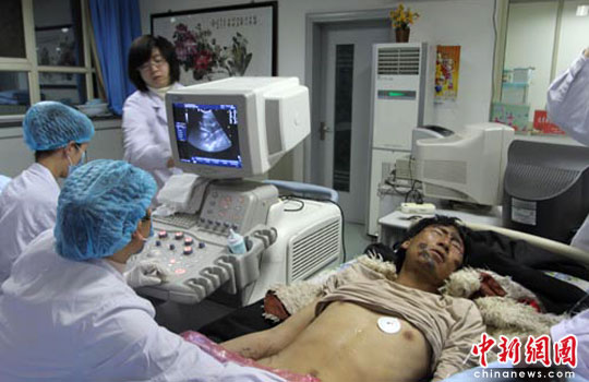 甘肃省人民医院医护人员为伤员做B超检查。中新网发 张玉玺 摄