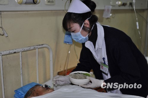 4月15日,青海玉树地震中受伤的54名伤员分成两批被送抵兰州,兰州大学第二医院医护人员为他们提供亲情服务。卫生部门称,还有后续伤员将择时送抵。中新社发 殷春永 摄