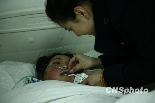 4月15日下午,青海玉树地震首批36名伤员随机抵达成都后立即被送往医院进行救治,目前,部分伤员已经完成基础手术,所有伤员伤势已经检查完毕,目前情绪比较稳定。百余名在成都生活的藏族志愿者也赶到医院当起翻译兼护理人员。图为甘孜藏族志愿者在病床旁为受伤小姑娘喂牛奶。中新社发 张浪 摄