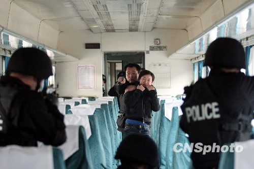 公安特警在列车上解救被劫持的人质。中新社发 万善朝 摄