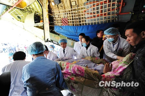 4月15日16时,在青海玉树机场,刚刚卸载下救援人员、急救药品等物资广空运输航空兵某师两架大型运输机又开始运送100余重伤员赴成都救治。六架不停地往返玉树与北京、成都、兰州、西安、西宁等地机场运送救灾物资和伤员。中新社发 沈玲 摄