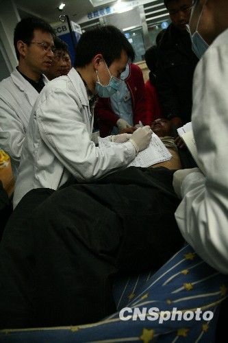 4月16日凌晨0点55分,继首批青海地震伤员抵达成都近7小时后,第二批青海地震伤员随机陆续抵达成都。图为医护人员正在记录伤员信息。中新社发 张浪 摄