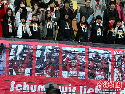 老车王舒马赫的忠实女粉丝在看台上倾尽全力为偶像助威。中新社发 任晨鸣 摄