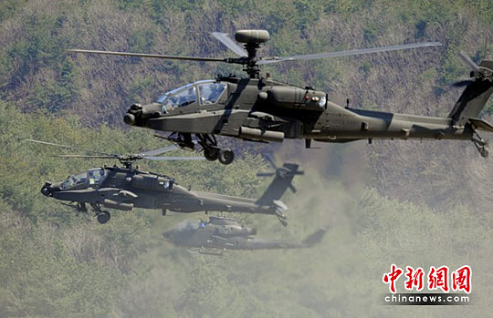 美军阿帕奇直升机在抱川基地进行实弹攻击演练。