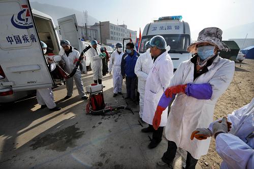 4月17日,玉树州体育场受灾群众安置点,疾控人员准备开展防疫消毒工作。李紫恒 摄