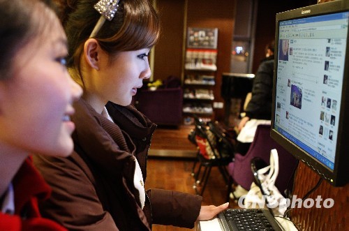 图为世博礼仪小姐上网看新闻。中新社发 钱兴强 摄