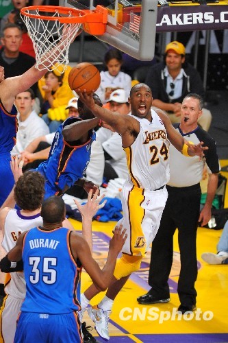 当地时间4月18日中午,洛杉矶湖人在主场迎战俄克拉荷马雷霆队,结果以87比79取得季后赛开门红。科比全场拿下21分。中新社发 张炜 摄