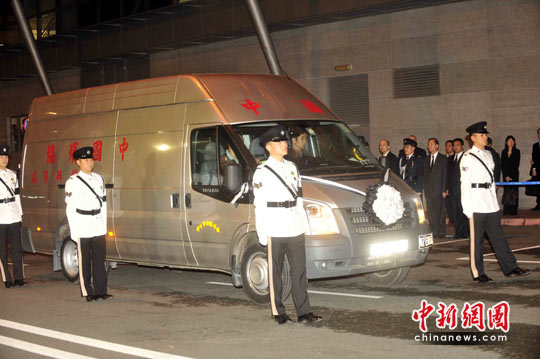 在青海地震中舍身救人的港人义工黄福荣,运送他遗体的灵车,4月18日晚上抵达深港西部通道边境口岸。香港特区政府举行遗体迎接仪式,警察仪仗队在灵柩盖上特区区旗,在风笛手吹奏哀乐下慢驶离开,运往殡仪馆。中新社发 谭达明 摄