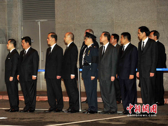 在青海地震中舍身救人的港人义工黄福荣,运送他遗体的灵车,4月18日晚上抵达深港西部通道边境口岸。香港特区政府举行遗体迎接仪式,多名主要官员包括律政司司长黄仁龙(左)及民政事务局局长曾德成(左三)等出席仪式。中新社发 谭达明 摄