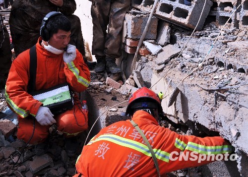 2010年4月18日,在青海玉树地震灾区现场,救援人员使用先进探测仪器,争分夺秒抢救生命。中新社发 章轲 摄