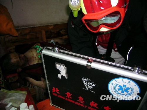 北京急救中心队员救援地震灾区村民。中新社发 张正尤 摄