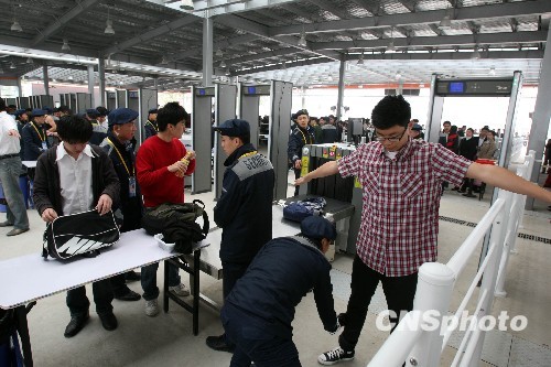 4月20日,上海世博会举行首场试运行。组织者旨在通过试运行全面、系统地检验世博会园区展馆、基础设施、信息化系统、文化演艺活动、安保、参观者服务、志愿者、后勤保障及突发事件综合应对等各项运行准备工作。图为警方对每位入园参观者进行严格安检。中新社发 汤彦俊 摄