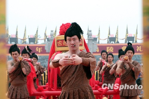 4月20日,礼生向大禹陵敬献黄酒和三牲五谷。当日,2000余名海内外来宾和社会各界代表,汇聚具有7000年悠久历史的浙江省绍兴市,举行2010年公祭大禹陵典礼。“北祭黄帝陵,南祭大禹陵”,是华夏后代祭祀祖先的传统方式。1995年浙江省和绍兴市政府联合举行了公祭大禹陵典礼。这是上世纪三十年代后期停祭大禹陵后的第一祭。此后,当地采取公祭与民祭相结合的方式,每年举行祭祀活动。中新社发 袁云 摄