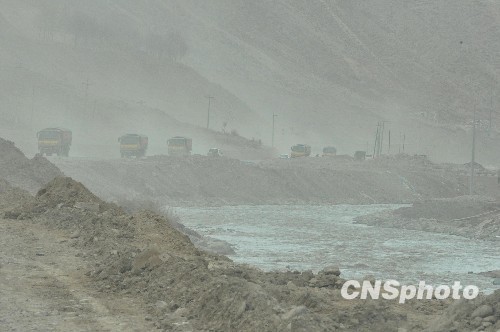 4月中旬青海玉树地震灾区风沙迷漫,中国各地军民车队在风尘滚滚中驰援青藏高原偏僻一角的玉树,艰难开通抗震救灾大通道。中新社发 贾国荣 摄