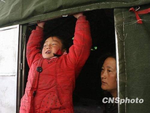 玉树结古镇红旗小学一年级学生罗菁瑜在临时帐篷里与妈妈一起玩耍。中新社发 苏丹 摄