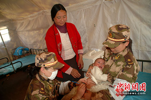 武警青海总队医院抗震救灾医护人员对前来就诊的玉树儿童给予无微不至的细心呵护。严万宝 摄