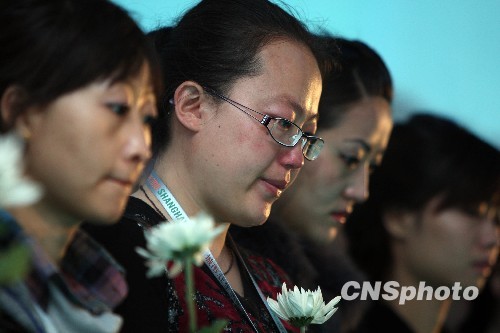 4月21日10点,上海世博青海馆工作人员举行仪式哀悼玉树地震遇难者。当日,全国举行哀悼活动,深切哀悼青海玉树地震遇难同胞。中新社发 汤彦俊 摄
