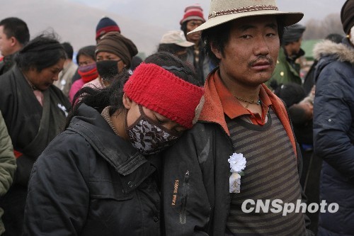 4月21日,为表达全国各族人民对青海玉树地震遇难同胞的深切哀悼,中国国务院决定,举行全国哀悼活动,全国和驻外使领馆下半旗志哀,停止公共娱乐活动。图为青海玉树灾区参加悼念活动的民众。中新社发 苏丹 摄