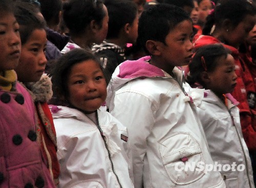 4月21日,青海玉树地震遇难同胞悼念活动上午10点在玉树结古镇镇政府举行,幸存的小学生们向地震遇难同学表示深切哀悼。中新社发 黄敏 摄