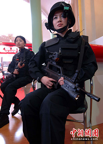图为中国兵器工业部208研究所展示警用单兵综合作战系统,该系统包括武力攻击、侦察与观瞄、信息处理、分队组网与通信、综合防护与携行等五大功能。中新社发 邹宪 摄