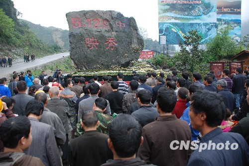 4月21日,四川汶川县在“5.12”地震震源点映秀镇天崩石处举行悼念玉树地震遇难同胞仪式。中新社发 钟美兰 摄