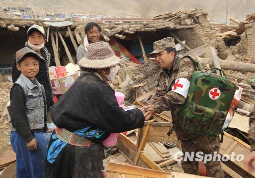 成空某场站驻玉树机场夜航灯光和医疗小分队官兵,利用白天休息时间,带上食物和药品赶赴重灾区结古镇,进村入户走访、了解受灾群众生活情况,为他们送去空军官兵的温暖。中新社发 刘应华 摄