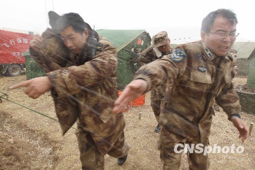 青海玉树机场,9、10级狂风中救灾的空军官兵奋力抗击固定帐篷。中新社发 刘应华 摄